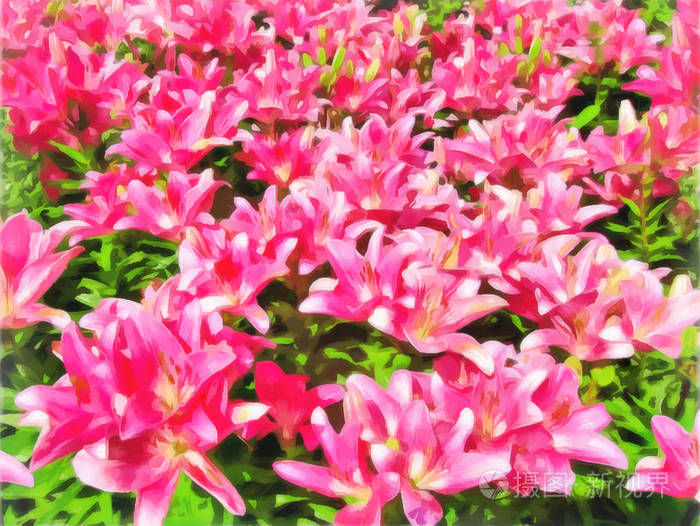 百合花的花坛 明亮的粉红色和红色的丁香花靠近 水彩画 丙烯酸画 数字绘画插图 自然景观 照片 正版商用图片18r0ii 摄图新视界